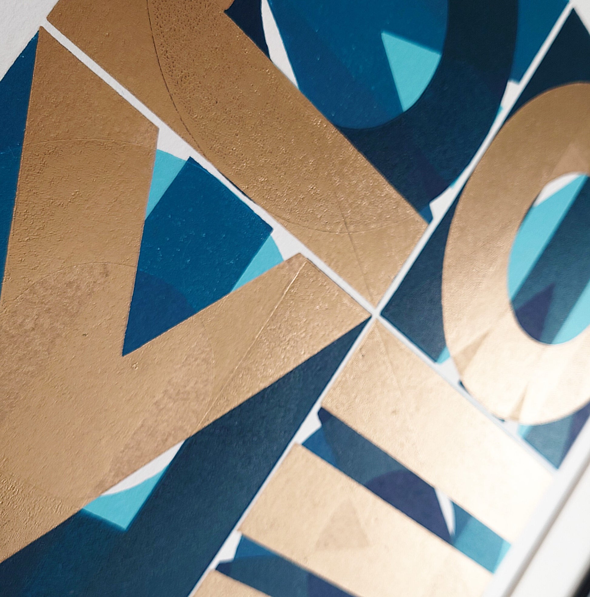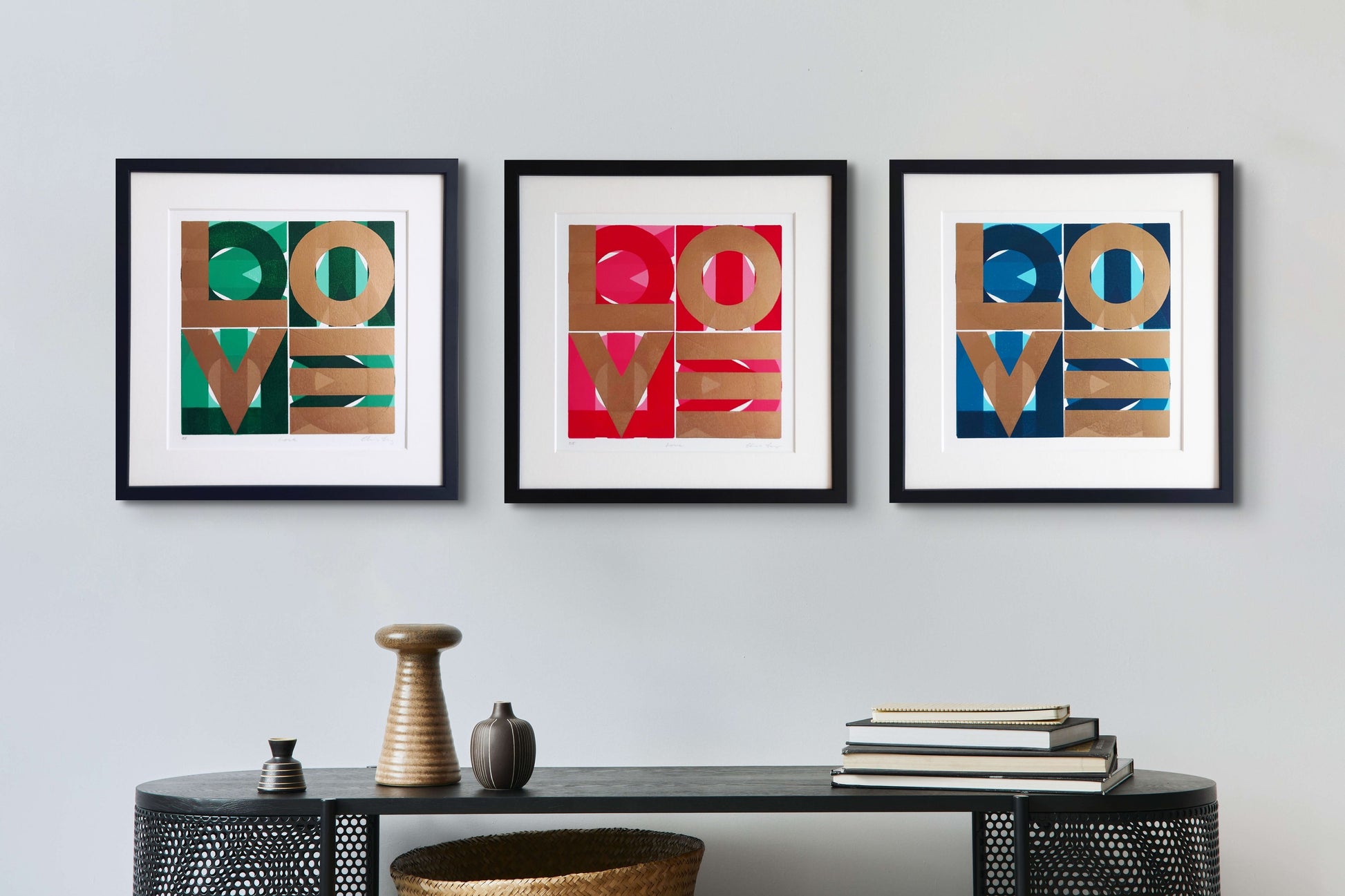 Transform your walls with this captivating original fine art lino print, featuring a beautiful combination of teal, blues and stunning metallic gold ink. A hand pulled print with professional oil-based relief inks on luxurious archival acid-free paper, the 'Love' design is a refined and timeless addition to any space.