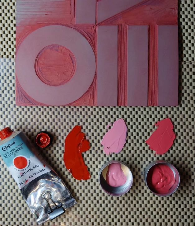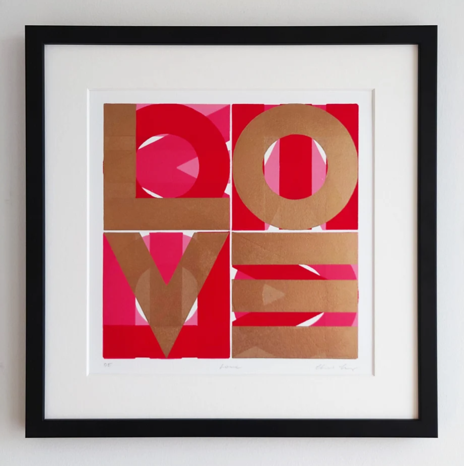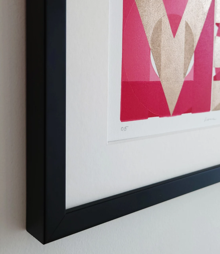 Transform your walls with this captivating original fine art lino print, featuring a beautiful combination of rich reds and pink and stunning metallic gold ink. A hand pulled print with professional oil-based relief inks on luxurious archival acid-free paper, the 'Love' design is a refined and timeless addition to any space.