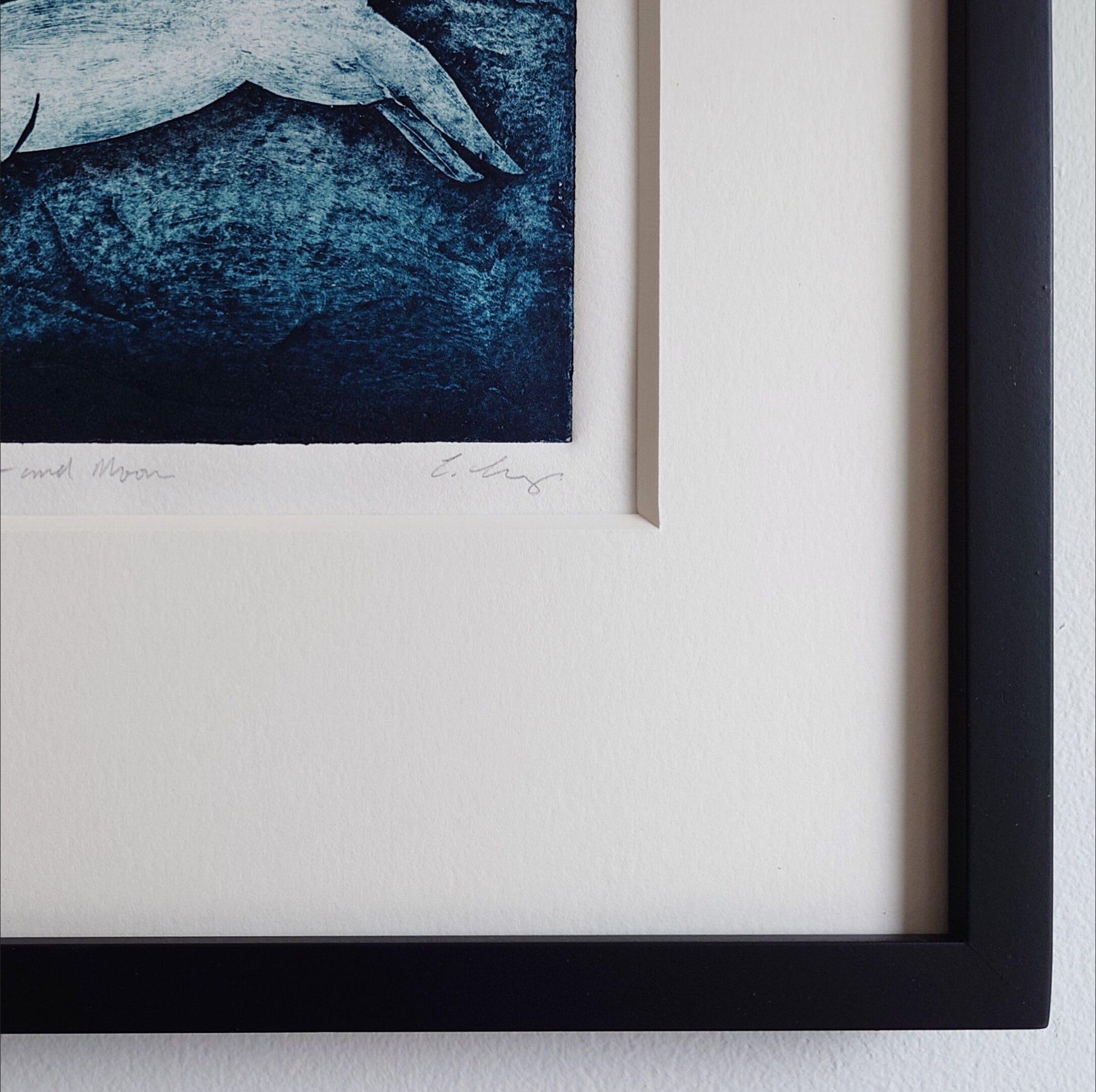 Frames are high quality wooden, glass fronted photo/art frames with a smooth black finish. The mount board is 3.5 mm thick in soft white with a cut out that allows the title, edition details and signature to be seen. The mount board is acid free to protect the artwork and to prevent discoloration.