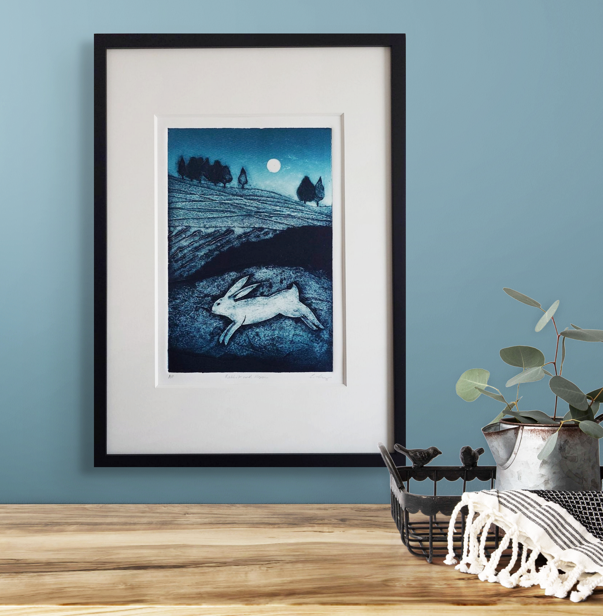 One of a series of prints inspired by the British countryside, Rabbit under the Moon depicts a wild rabbit moving through the fields under a clear night sky. The print captures the stillness and simplicity of rural landscapes — a familiar scene for anyone who walks the the paths alongside hedgerows, fields and woods at dusk.