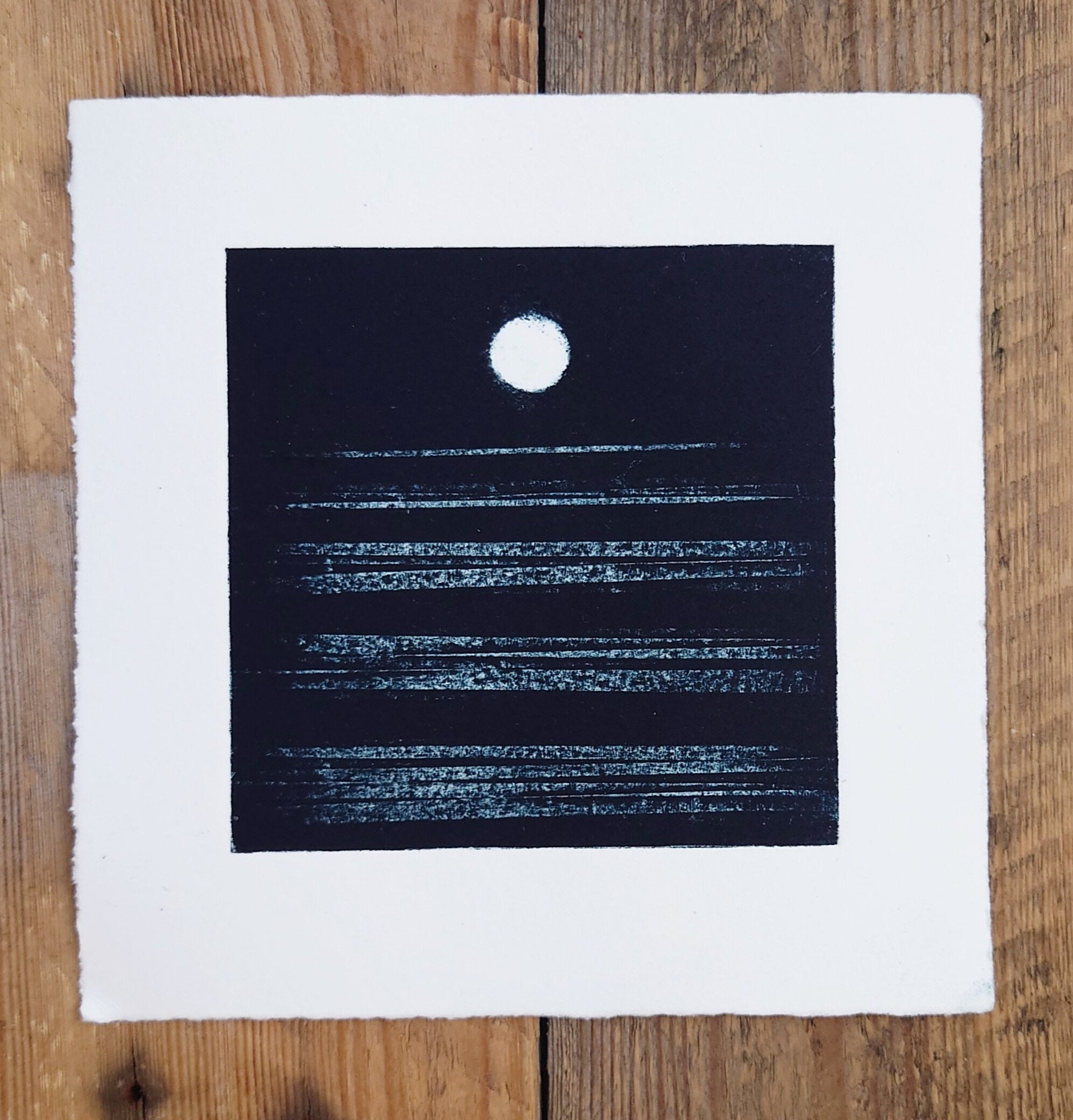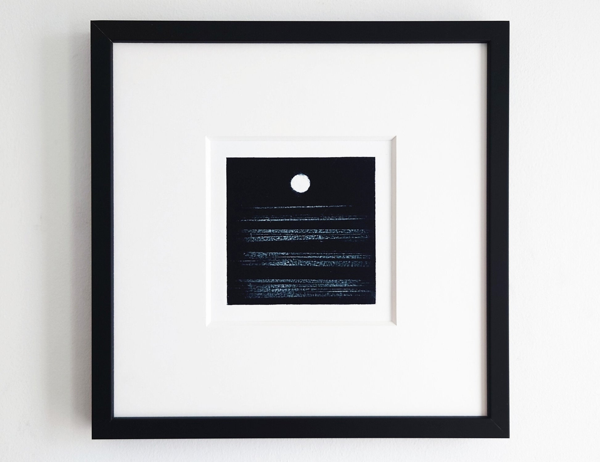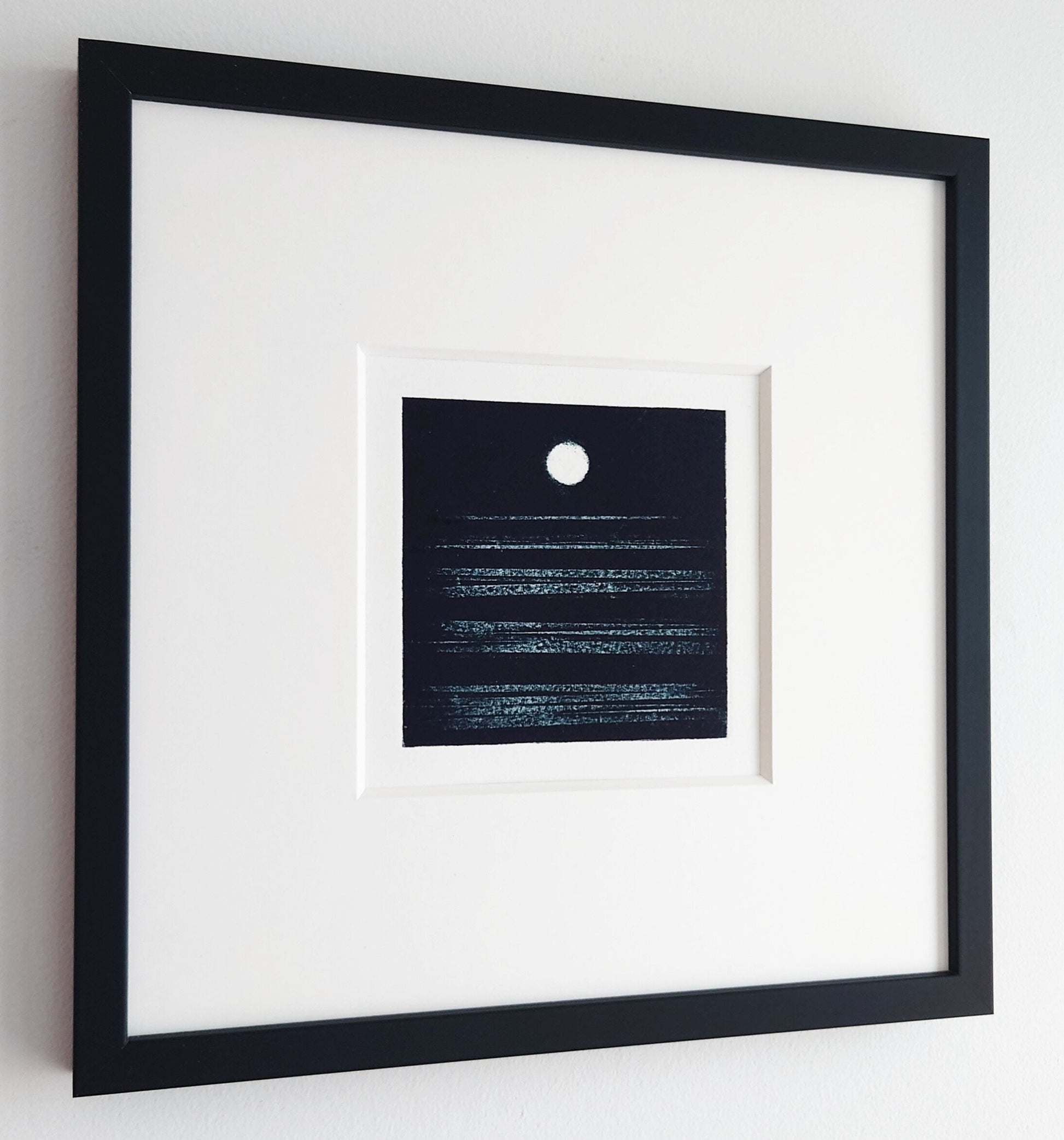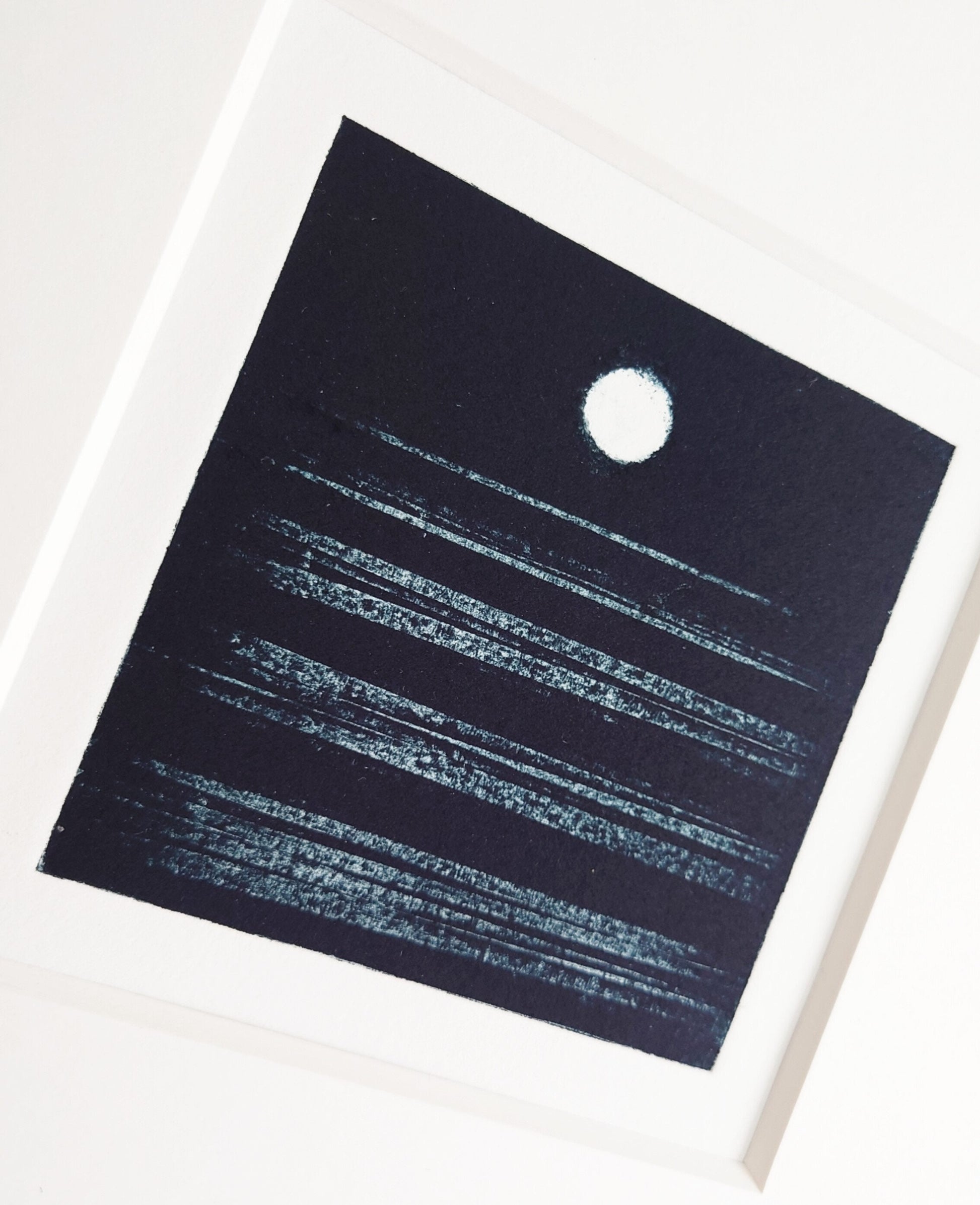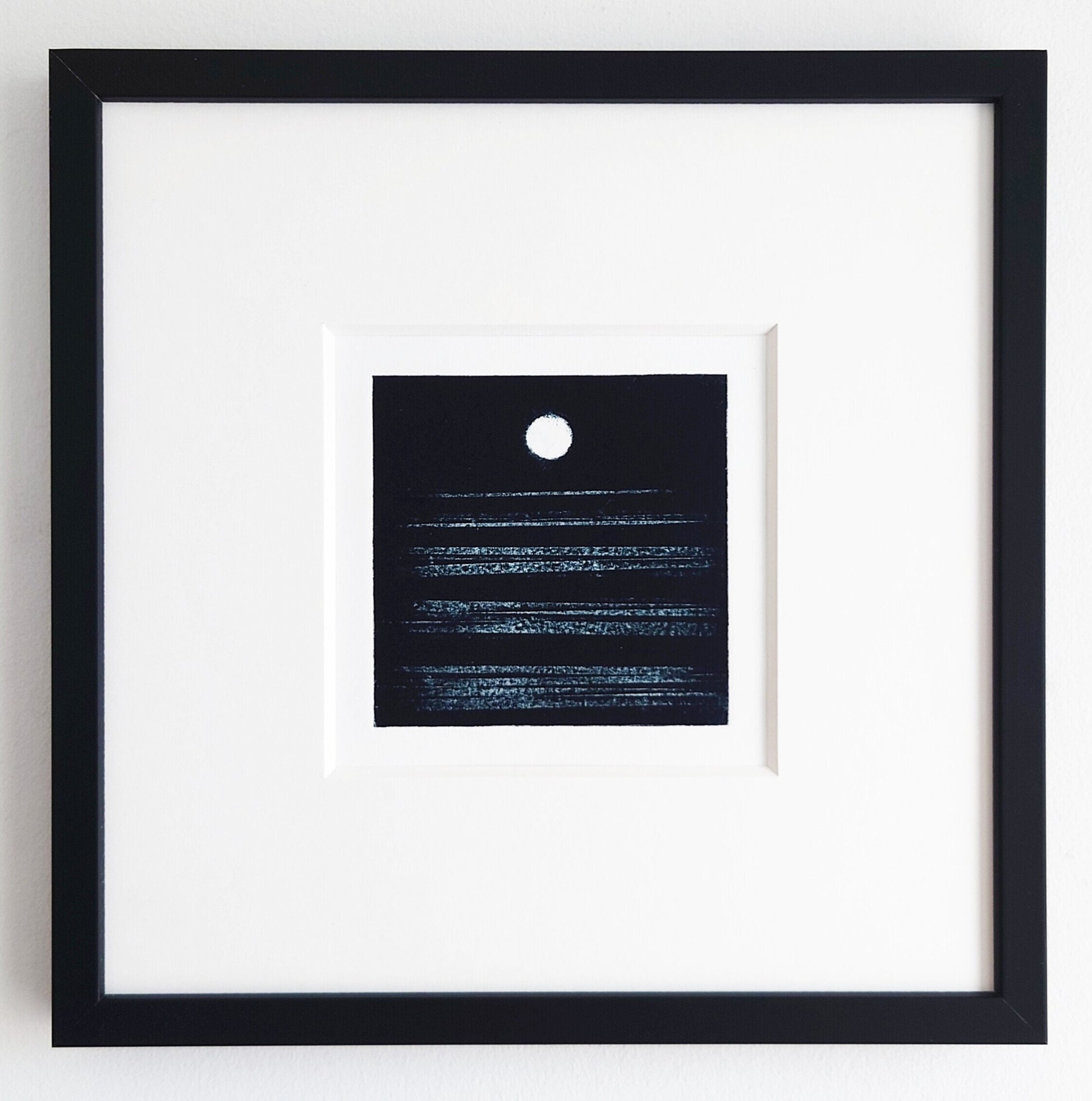 This unique piece captures the moon's reflection over a peaceful sea. Crafted on high-quality Somerset cotton paper, this one-of-a-kind collagraph/carbarundum print is carefully made with premium Caligo black ink. This is an exclusive edition limited to just 15 prints.