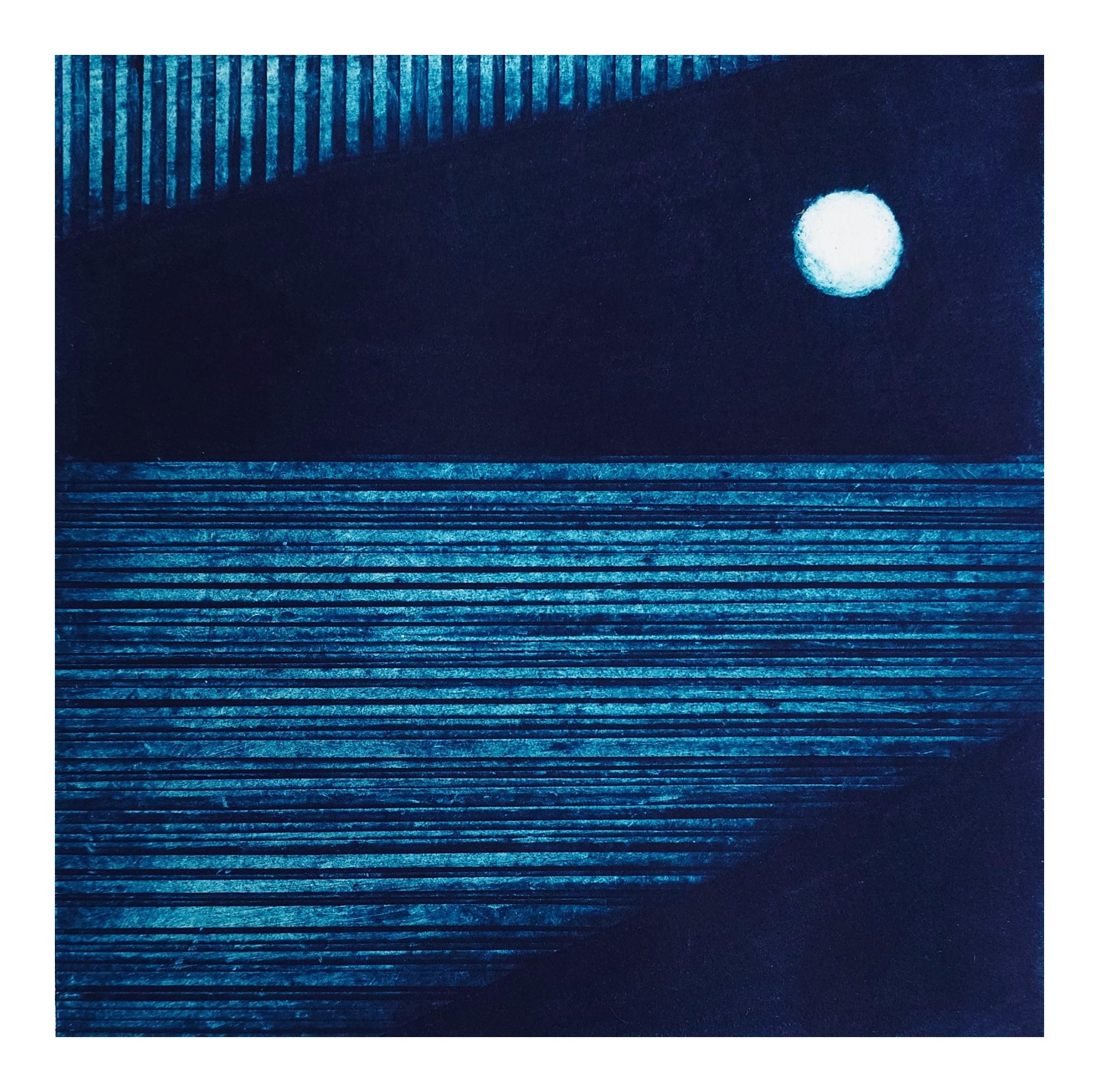 This unique piece captures the moon's reflection over a peaceful sea. Crafted on high-quality Somerset cotton paper, this one-of-a-kind collagraph/carbarundum print is carefully made with premium Caligo inks. This is an exclusive edition limited to just 40 prints.