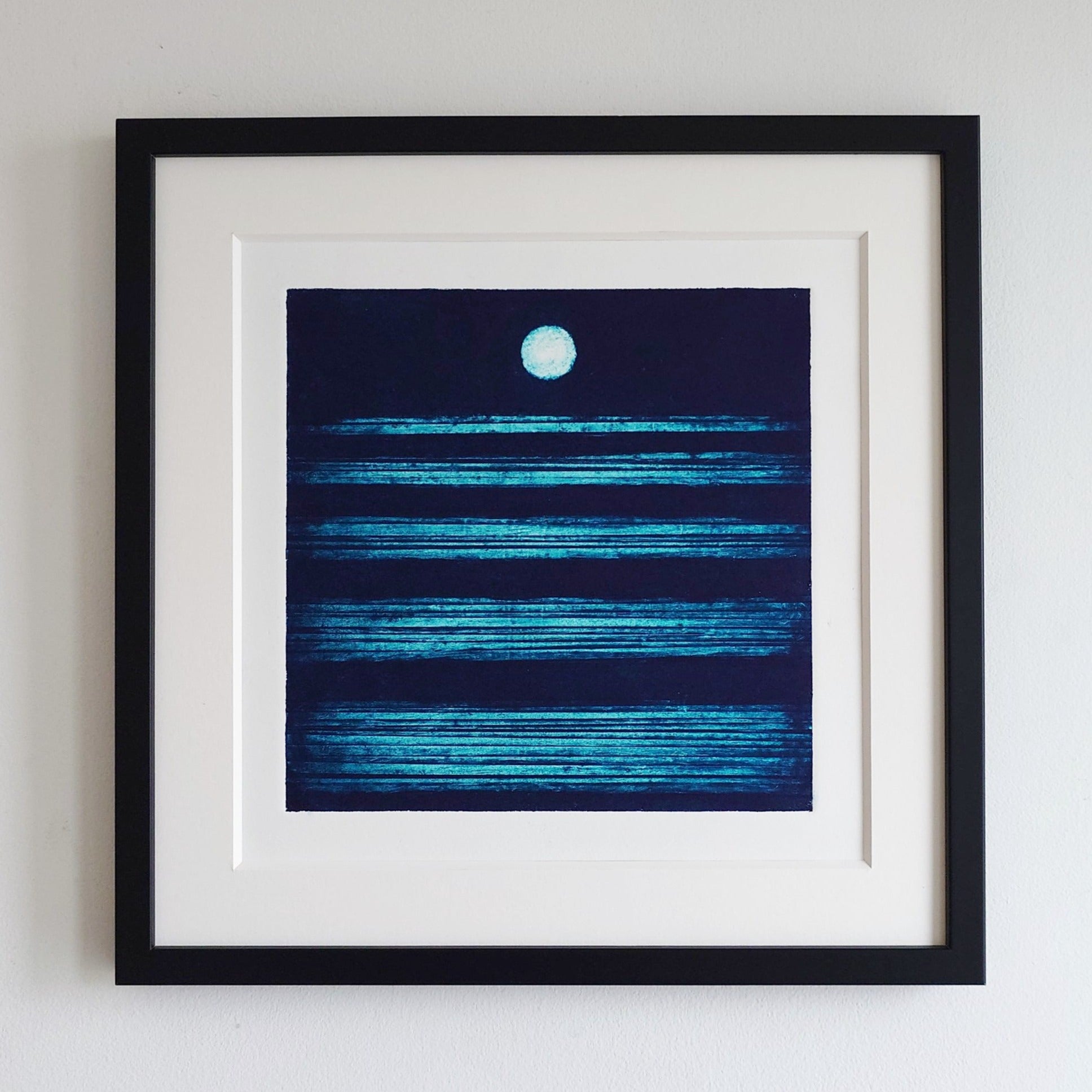 This unique piece captures the moon's reflection over a peaceful sea. Crafted on high-quality Somerset cotton paper, this one-of-a-kind collagraph/carbarundum print is carefully made with premium Caligo inks. This is an exclusive edition limited to just 40 prints.