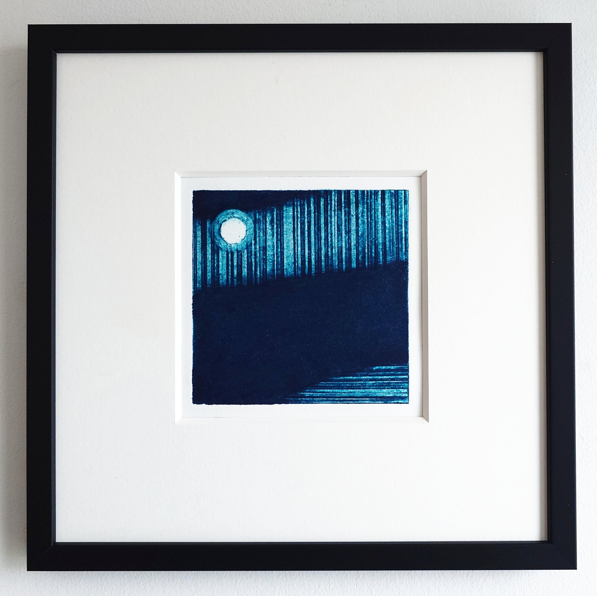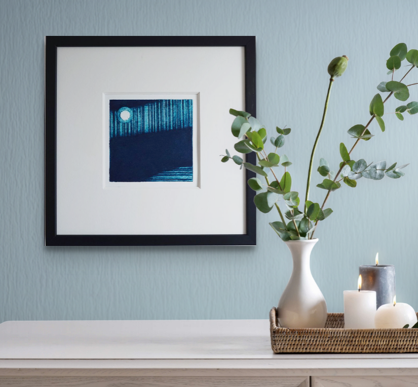 This unique piece captures the moon's reflection over a peaceful sea. Crafted on high-quality Somerset cotton paper, this one-of-a-kind collagraph/carbarundum print is carefully made with premium Caligo inks. This is an exclusive edition limited to just 40 prints.